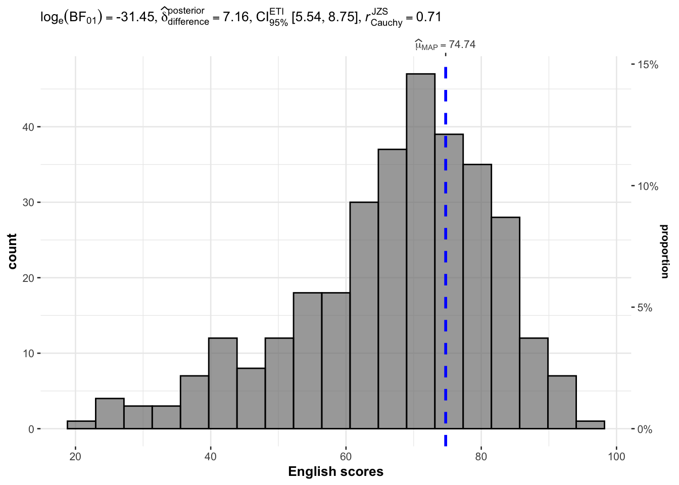 In the code chunk below, gghistostats() is used to to build an visual of one-sample test on English scores.