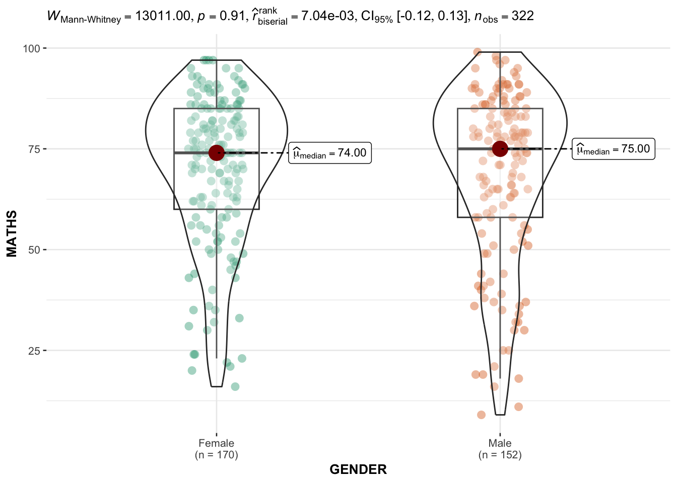In the code chunk below, ggbetweenstats() is used to build a visual for two-sample mean test of Maths scores by gender.