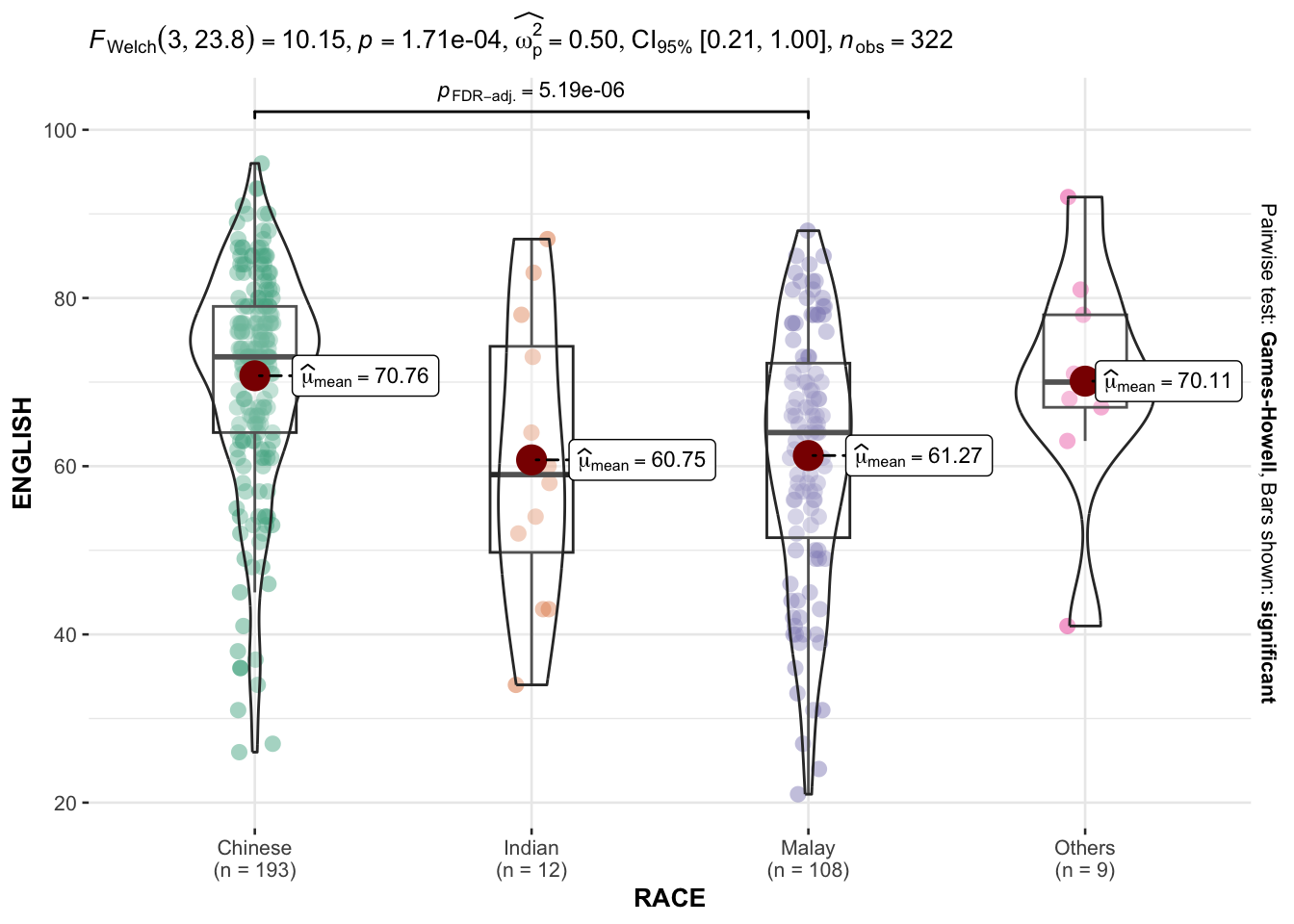 In the code chunk below, ggbetweenstats() is used to build a visual for One-way ANOVA test on English score by race.