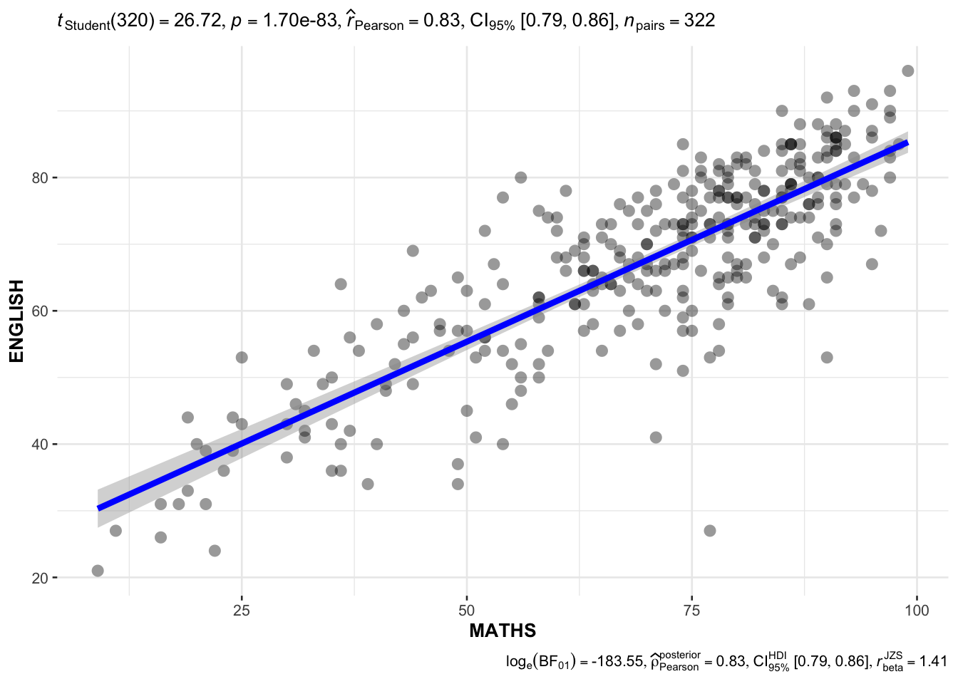 In the code chunk below, ggscatterstats() is used to build a visual for Significant Test of Correlation between Maths scores and English scores.